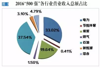 500强营业收入总额大幅下降,主要是受石油、煤炭等传统能源企业收入下降的影响,尤其是以中国石油化工集团公司(以下简称“中石化”)等为代表的石油企业业绩不佳,严重影响了500强的整体表现。2016中国能源集团500强总营业收入比去年下降2.56万亿元,其中石油行业减少2万亿元,贡献率78.46%;煤炭行业减少7244亿元,贡献率28.30%。由于石油、煤炭等企业在500强营业收入中占比过高,新能源、燃气等行业的收入增长难以弥补传统能源行业下降带来的缺口。2016中国能源集团500强各细分行业营业收入增速及各行业收入在500强中的占比结构详见图2和3。
