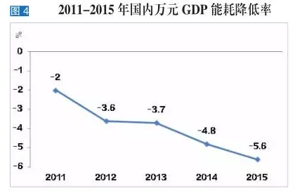 500强营业收入占GDP的比重逐年下降,一方面源于经济增速放缓降低了对能源的需求,另一方面,随着我国经济结构调整,经济活动对能源的依存度下降。2015年,全球一次能源消费量增长仅1%,所有化石燃料的价格全部下跌,原油价格录得自1986年以来最大跌幅;全球煤炭价格已连续四年下跌;天然气价格也有所下跌。我国能源消费总量比上年增长0.9%,增速为自1998年以来的最低值。与此同时,我国单位GDP能耗下降率逐年提升,2015年下降率达到5.6%,为过去5年的最高值(见图4)。