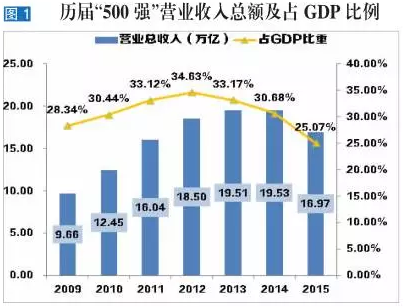 2016中国能源集团500强入围门槛比上年增长7.98%,达到8.39亿元。然而,入围门槛的提高没能助推500强整体规模的提升,与之相反,500强大幅缩水,总营业额比去年下降13.11%,首次出现负增长,占GDP的比重也大幅下降至25.07%,为历届最低点(见图1)。