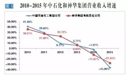 自2014年营业收入首次下滑以来,2015年中石化营业收入再次大幅下滑35.99%。过去6年中石化营业收入增速见图5。受国际原油价格继续下降的影响,前10强中的中石油、中国海洋石油总公司及中国中化集团公司均遭受重创,营业收入降幅均在两位数以上。2015年,全球石油供需宽松程度进一步加大,全年供大于需达170万桶/日。WIT和普氏布伦特原油期货全年平均价格分别为48.76美元/桶和53.60美元/桶,同比分别下降45.52%和46.11%。同时,国内石油消费持续中低速增长,原油消费量增长5.6%,增速同比回落0.3个百分点。然而,同样面对上述不利的大环境,中国华信能源有限公司的表现却非常亮眼,2015年,其营业收入大增22.97%。民营企业在应对市场变化方面的优势由此可见一斑。