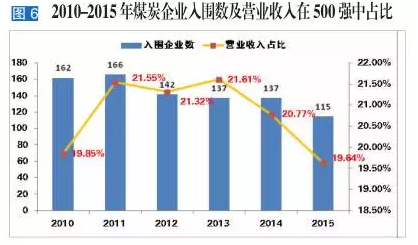 纵观过去6年煤炭行业在500强中的表现(见图6),无论是从上榜企业数,还是在500强总营业收入中的占比来看,2015年煤炭行业都到了冰点。产能过剩,加上去煤化的大环境,煤炭企业面临转型和煤炭清洁化的严峻挑战。