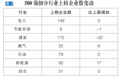 自2012年煤炭价格下滑以来,产能严重过剩和需求不足困扰着煤炭行业。2015年,煤炭消费量下降3.7%。在政府的大力推动下,全国全年共淘汰10167万吨落后和过剩产能,然而过剩产能依然没有出清,煤价继续下滑。经过连续4年的价格下降,煤炭企业元气大伤,2016中国能源集团500强中,神华集团和山西焦煤集团有限责任公司跌出前10名,山西煤炭进出口有限公司、晋能有限责任公司和开滦(集团)有限责任公司退出千亿级企业行列,煤炭企业上榜数锐减22家,成为本届上榜企业下降最多的行业。各行业上榜企业数增减情况见表2。