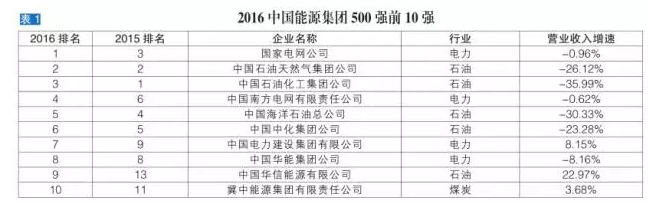 2016中国能源集团500强前10名的阵容发生巨变,首先是石油行业巨头中石化失去了维持六年的位置,跌落至第三,国家电网公司取而代之,打破了多年来中石化、中国石油天然气集团公司(以下简称“中石油”)、国家电网公司的排列格局。其次是煤炭行业龙头企业中国神华集团有限责任公司(以下简称“神华集团”)首次无缘前10强,从上届的第七降至第十一。中国华信能源有限公司和冀中能源集团有限责任公司则首次进入前10强。前10强名单见表1。