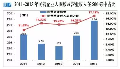 2016中国能源集团500强民营企业入围数量由上一年的281家上升至294家;营业收入总额由2.79万亿元增加至2.90万亿元,占500强总营业收入的17.12%,增长2.84%。民营企业在500强中的地位自2013年后逐年提升(见图8)。