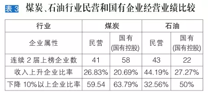 此外,与国有或国有控股企业相比,民营企业显示出较强的市场适应能力。本届有237家民营企业连续两年上榜,其中155家营业收入上升,上升率65.40%,而国有或国有控股企业的这一指标仅为40.1%。在新兴市场领域,92家新能源企业中,民营企业占据了72位,其中前10名均为民营企业。在传统煤炭和石油能源领域,从营业收入上升企业比率及企业收入下降幅度占比两个维度看,民营上榜企业的经营业绩明显好于国有或国有控股企业(见表3)。