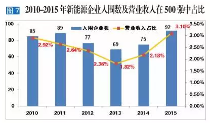 在92家上榜企业中,新上榜23家,69家连续两年上榜,其中55家排名上升,上升率80%。80%以上的新能源企业营业收入比上年增加,其中增幅在50%以上的企业21家。新能源企业的成长还体现在规模的持续扩张上。2015年,新能源行业在500强营业收入中的占比提升到3.1%(见图7)。