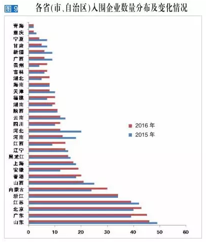 此外,内蒙古和江西的表现亦可圈可点,入围企业数分别增加6家和5家,位居各省市的前列。山东省上榜46家成为连续六届入榜企业数量最多的省份;北京保持第三名,有43家企业入榜。江苏、浙江、内蒙古、山西依然位列前十,排名变化不大。各省市入围企业数及变化情况见图9。