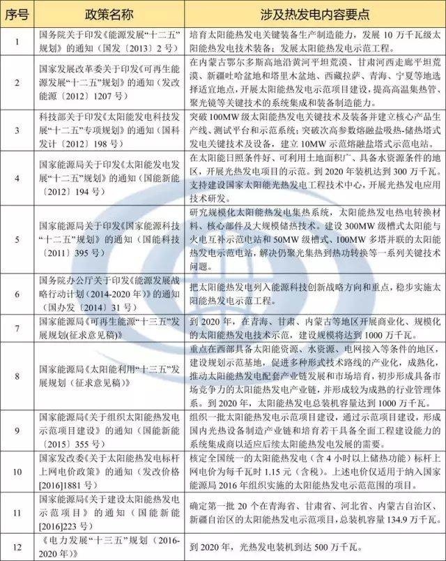 “十二五”以来,国家层面、国家发展改革委、能源局和科技部先后出台多项规划和政策支持太阳能热发电产业发展,具体政策汇总见下表:
